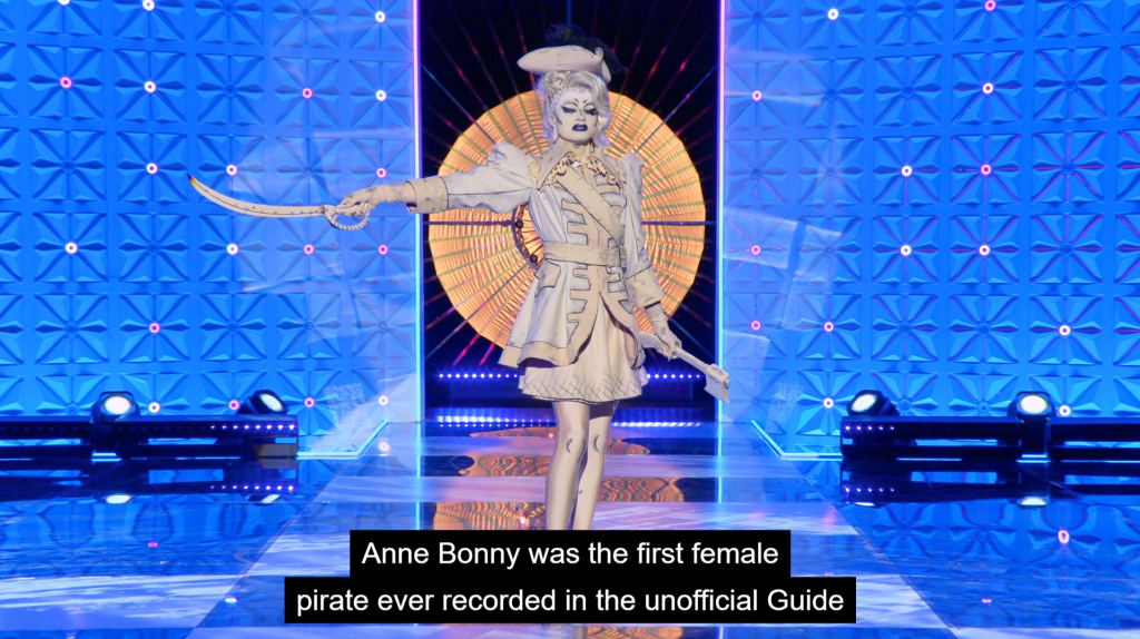 Speaking of Ru, she walks in to tell the girls that this is the Rusical episode, and they’re doing a Peter Pan adaptation this time around. I hold very little hope that it’s going to be as good as Drag Race España‘s recently aired adaptation of The House of Bernarda Alba. But already, Paige is setting herself up for a fall as she declares in the confessional that she has skills that will work for this challenge.